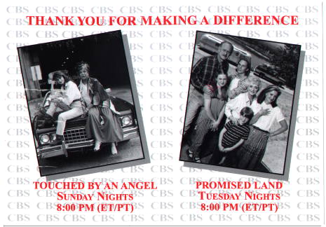 By early the following year, my father was doing much better (thank God!) but I was still catching every episode of TBAA and I looked for fans on the internet. I was surprised to see an old 'net buddy, Red, had put up a fan page for it where we could write each other. That page was the earliest root of what has become the TBAAngel mailing list. I think it boasted the largest mailto: link I have ever seen in my life. It was around this time that TBAA was preempted three weeks in a row by NCAA basketball. This was especially worrisome since on one of those nights, the game was finished before TBAA's timeslot and the network had chosen to air Dr. Quinn at the wrong time rather than TBAA at the right time. Those on the webpage list wrote the network to protest and the studio to offer encouragement. One of the neatest things to come out of that bout of writing were these postcards that they sent us to let us know whenever changes in the show's schedule occured. ![]()